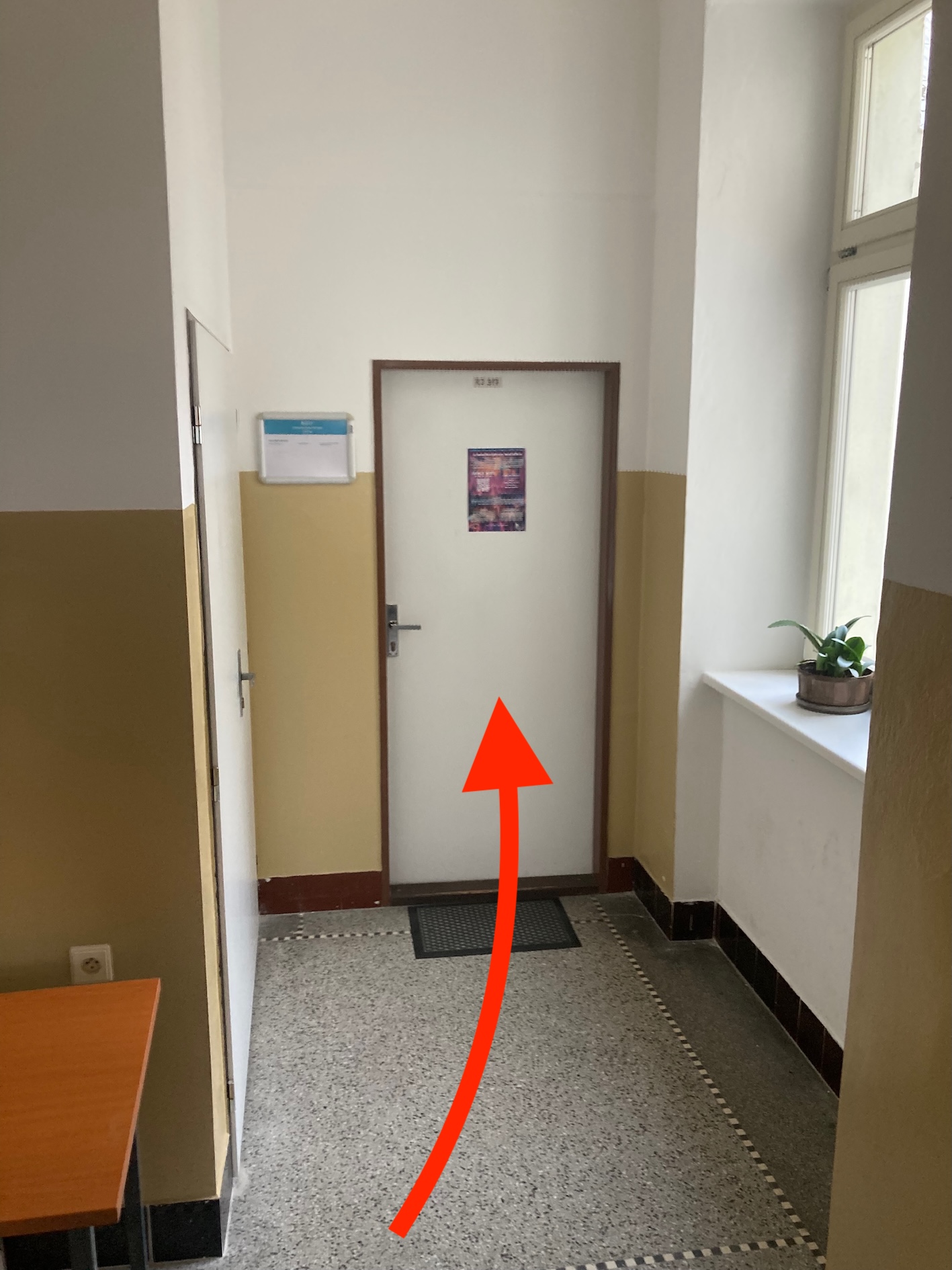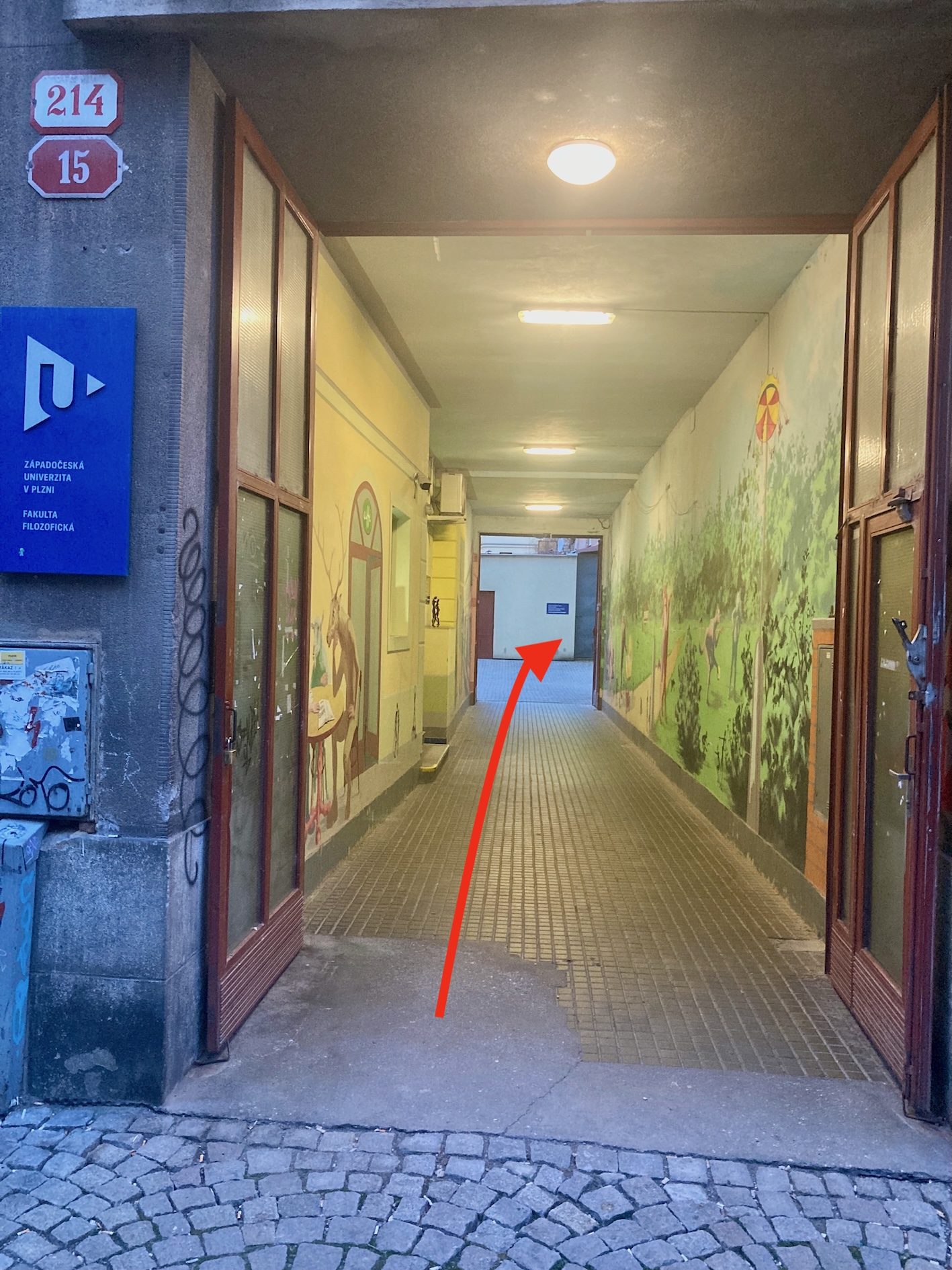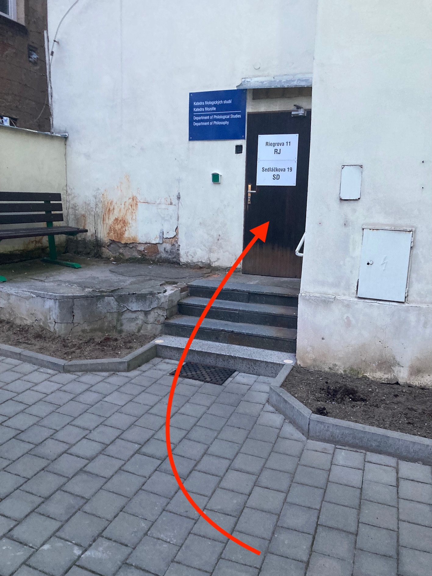 In the yard, enter the door on the right-hand side. (You’ll recognize it by two white plastic posters on the door: “Riegrova 11 / RJ” and “Sedláčkova 19 / SD”. There is also a blue sign for the Department of Philosophy / Department of Philosophical Studies next to the door.)