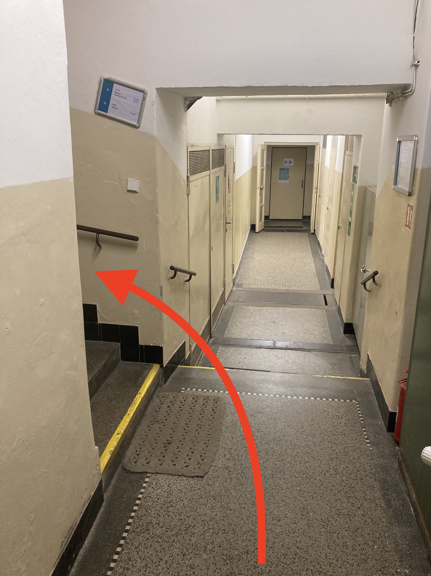 After entering, you’ll be in an indoor corridor. Turn immediately left to the first staircase.
